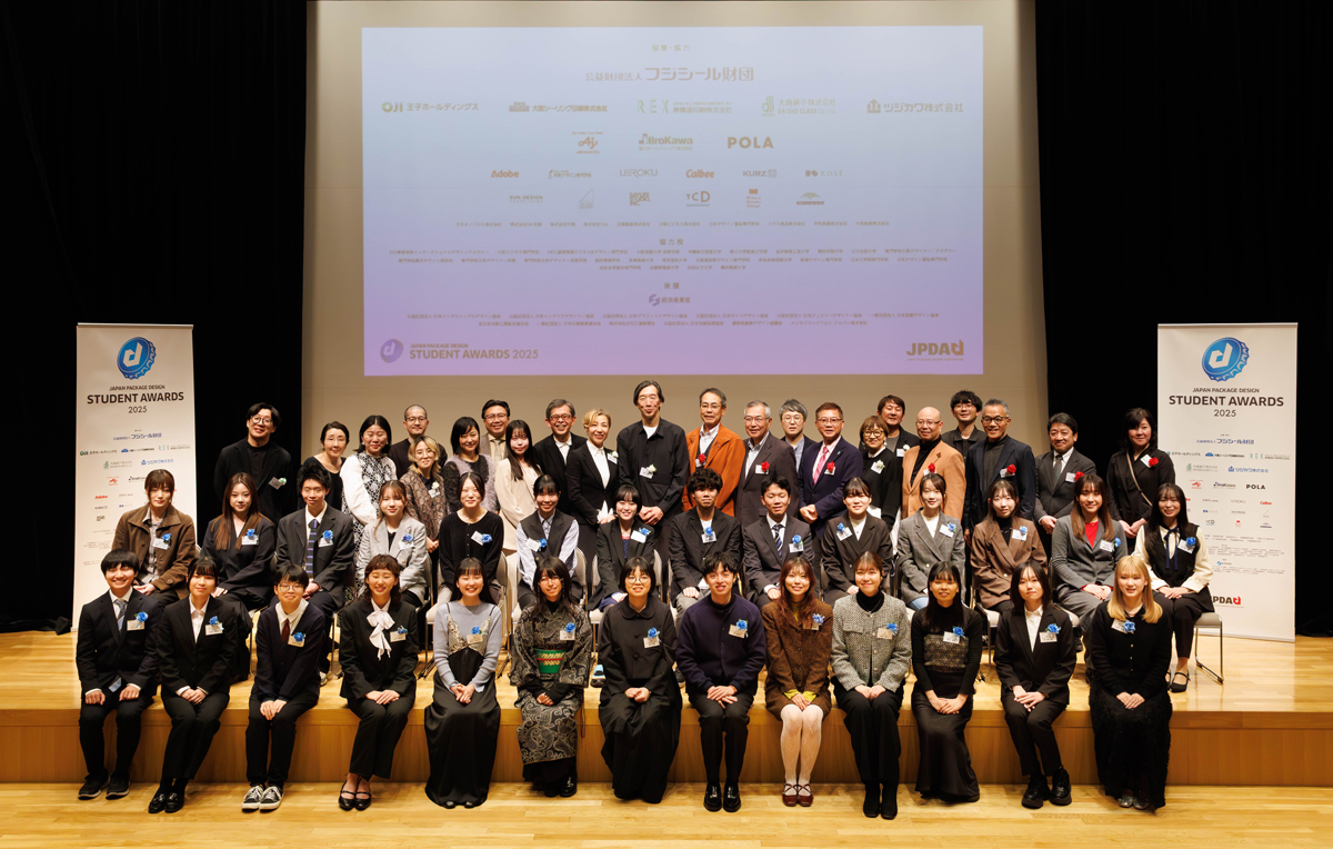 公益社団法人日本パッケージデザイン協会(理事長:信藤 洋二、以下JPDA)は、2025年11月26日(水)、文京シビック小ホール(東京都文京区)において、日本パッケージデザイン学生賞2025贈賞式を開催、受賞した27名の学生に大賞・金賞・銀賞・銅賞・企業賞(フジシール財団賞、王子ホールディングス賞、大阪シーリング印刷賞、寿精版印刷賞、大商硝子賞、ツジカワ賞)・審査員特別賞を贈りました。※銀賞、ツジカワ賞はダブル受賞