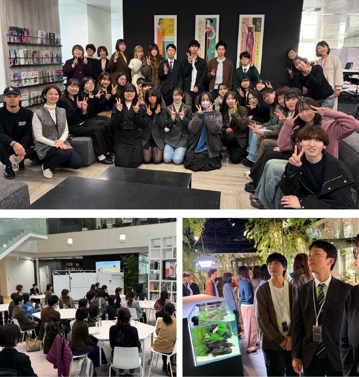 1番印象に残ったのは大きな水槽や豊かな緑が配置されたフロアで、落ち着いた雰囲気の中でリラックスしながら発想を広げられる空間になっていました。リラックスして制作に向き合える空間が整っていることも、良いデザインにつながるのだと実感しました。